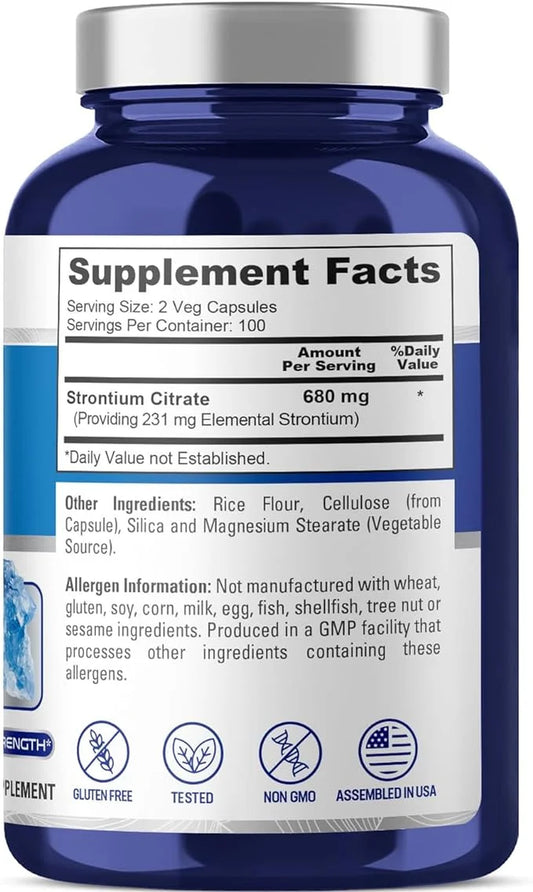 Strontium: 680 Mg, 200 Vegetarian Capsules (Non-Gmo & Gluten-Free) Dietary Supplement for Unisex Adult Health & Wellness